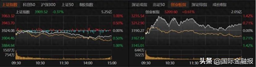 指数发扬分化,沪指收跌0.37%报3909.52点,创业板指收涨0.61%报3209.6点,深证成指、科创50、沪深300、上证50均微跌,北证50跌近2%。