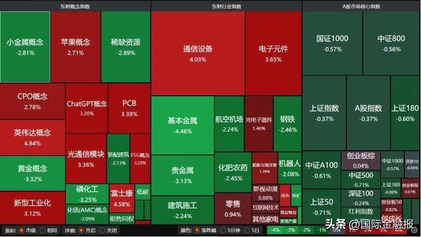 盘面上,科技股仍是资金偏疼标的。CPO倡导不时走高,通讯建立、电子元件、光电子器件、新式工业化、英伟达倡导大涨。但基本金属、黄金倡导、航空机场、贵金属、化肥农药、建筑施工、钢铁、机器东谈主等倡导跌幅彰着。