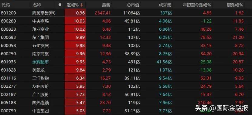 商贸零卖板块逆市昂首,中央阛阓、茂业买卖、东百集团、五矿发展、南京商旅、永辉超市、好意思凯龙7只关系个股涨停。